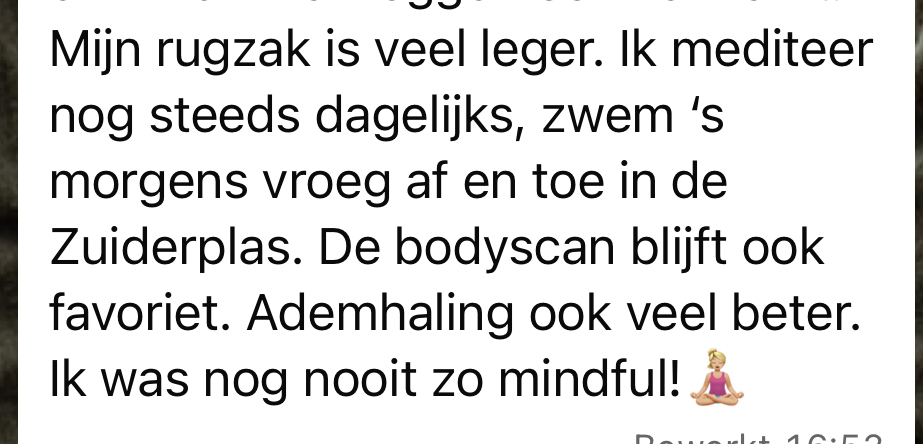 “De training gaf mij nog meer bewustwording van mijn gedachten en mijn lichaam, wat ik in combinatie met meditatie en ademhaling echt als heel waardevol ervoer. Het hielp me om meer in contact te komen met mezelf en van mijn hoofd naar mijn lijf te gaan. Ik zou de training absoluut aanraden aan anderen.”