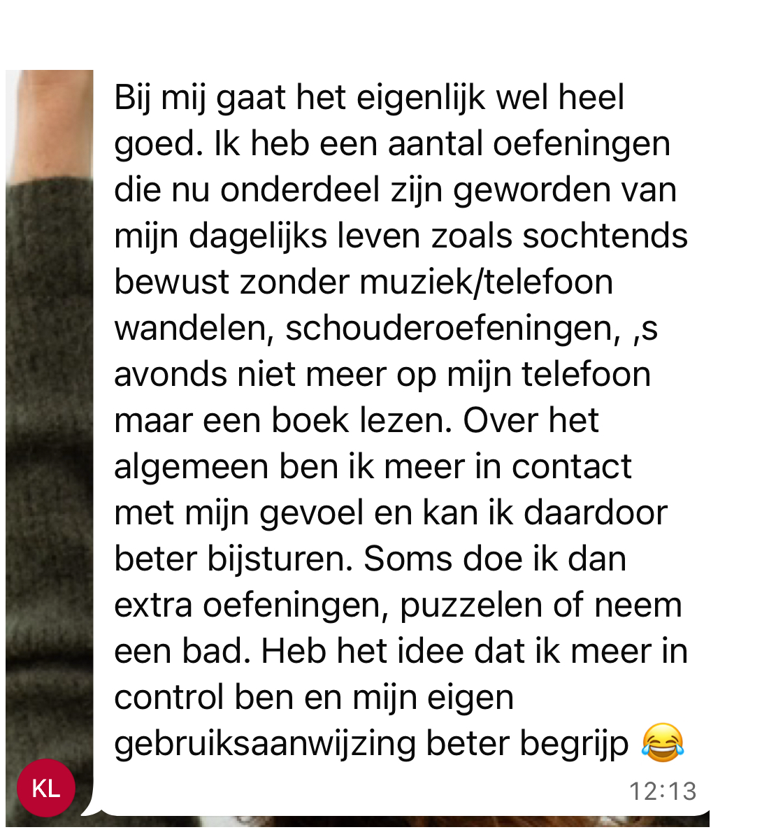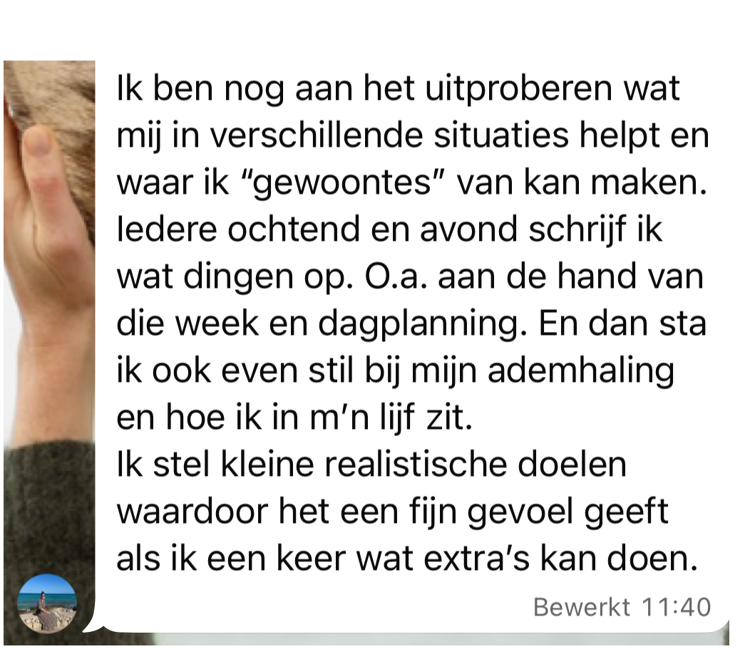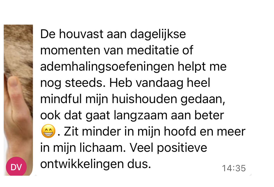 "Ik zit in een moeilijke fase in mijn leven, maar toch kan ik eindelijk weer slapen, de pijn in mijn borst is verdwenen en dagelijks bewust momenten van rust nemen, een ademhalingsoefening doen en naar m’n lichaam luisteren helpen om stress uit m’n lijf te krijgen. Ik begrijp nu pas waarom ik zo vaak zo moe ben en dat helpt me verzachten. Qua timing had de training niet beter gekund."