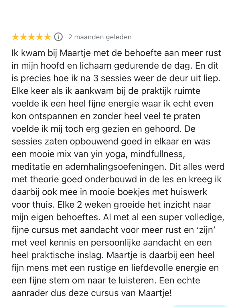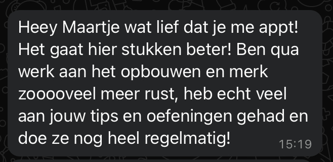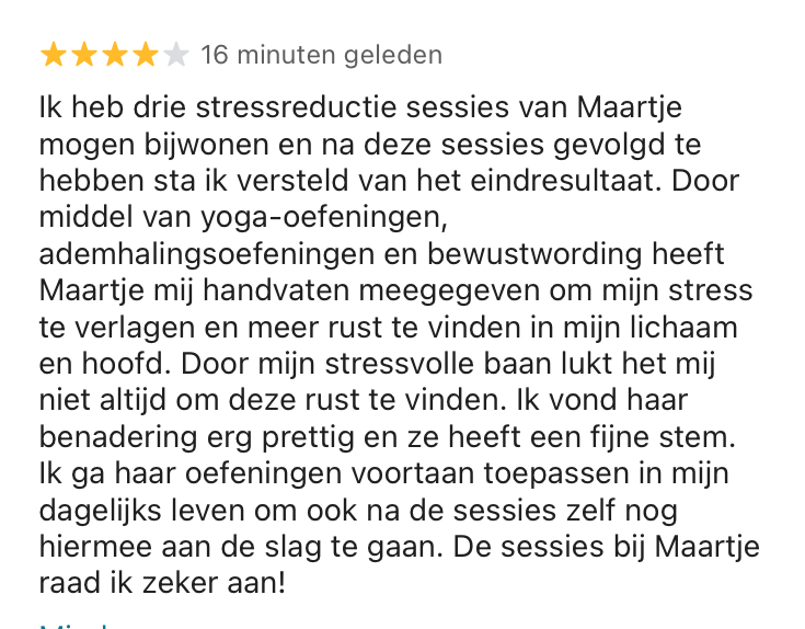 "Maartje heeft mij handvaten meegegeven om mijn stress te verlagen en meer rust te vinden in mijn lichaam en hoofd"