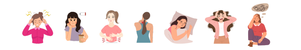 Ook ik had er last van: hoofdpijn, pijn in mijn nek, een opgeblazen buik, vermoeidheid, slecht slapen, piekeren, donkere gedachten, schommelende hormonen, wakker liggen, stress