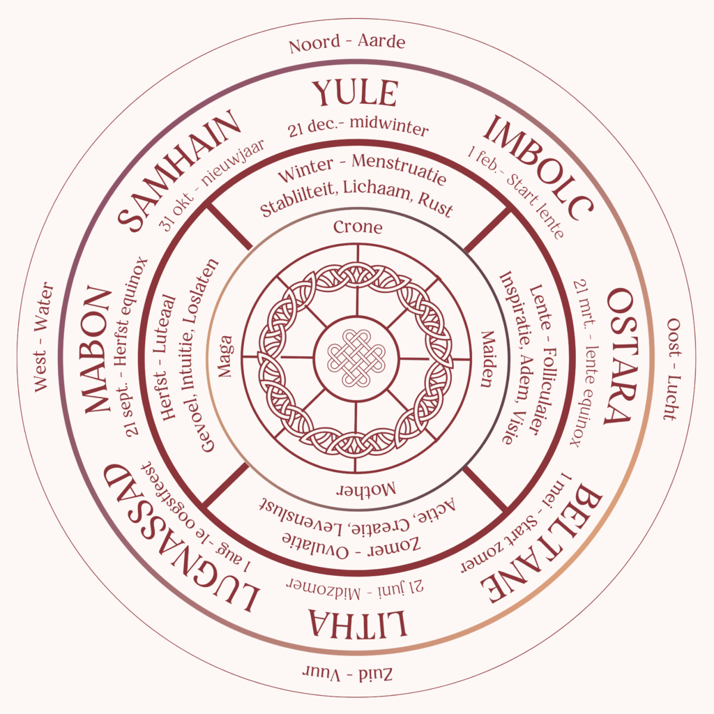 Deze cycli bewegen als spiralen door je lijf en je leven. We komen thema’s vaker tegen, maar nooit op exact dezelfde plek. Elke ronde brengt verdieping, wijsheid en verfijning. Steeds opnieuw bewegen we door fasen van opbouw, bloei, oogsten, verval en sterven en daarna weer een nieuw begin. Denk hierbij ook aan de archetypische vrouwelijke fasen: het meisje (maiden), de moeder (mother), de wijze vrouw (maga) en de oude wijze vrouw(crone).